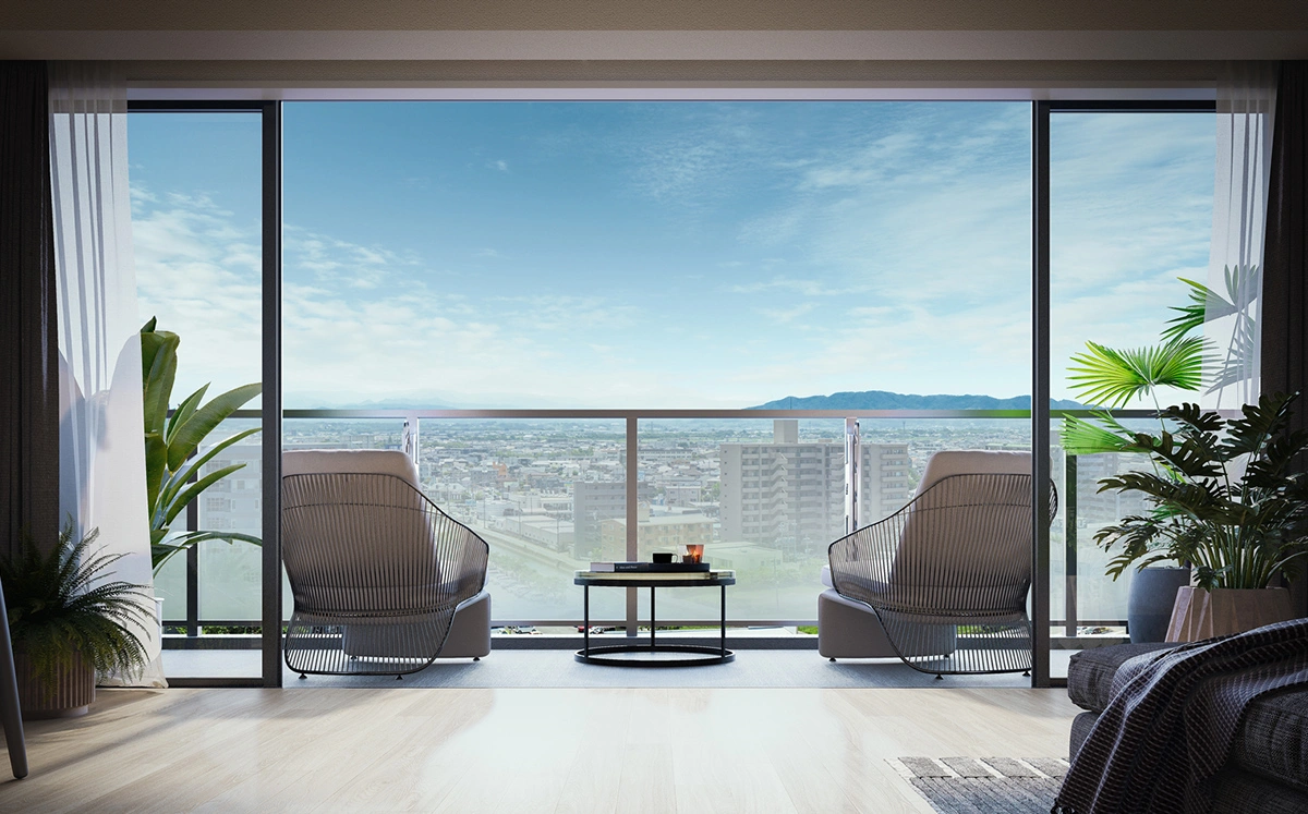 全ての住戸のリビングとバルコニーを南向きに配置。陽光を存分に取り込み、明るく開放感あふれる暮らしを実現します。さらに建物が隣接しないため、周辺に広がる眺望とともに、光と風邪を住まいへ心地よく招き入れます。