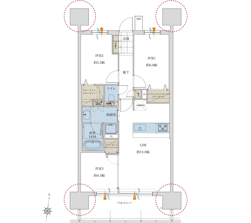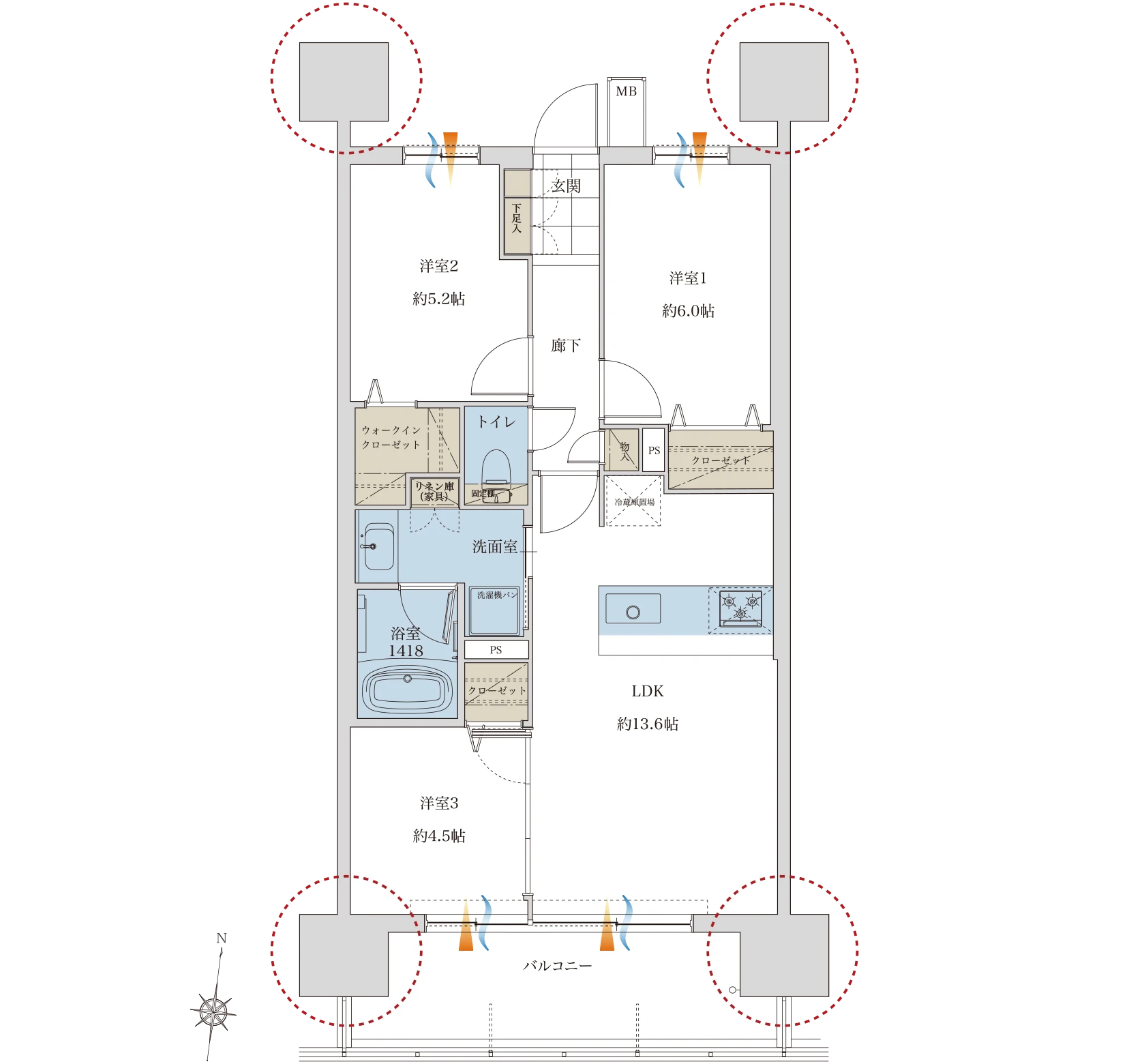 洋室(3)はリビングと一体利用で18.1帖の広々空間に